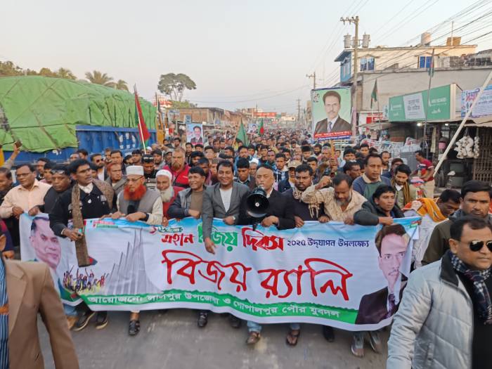 নাটোরের লালপুরে বিএনপি’র কেন্দ্রীয় নির্বাহী কমিটির সহ দপ্তর সম্পাদক অ্যাডভোকেট তাইফুল ইসলাম টিপুর উদ্যোগে মহান বিজয় দিবসের এক বর্ণাঢ্য বিজয় র্যালি অনুষ্ঠিত হয়েছে। মঙ্গলবার (১৬ ডিসেম্বর) বিকেলে উপজেলা ও পৌর বিএনপির আয়োজনে র্যালিটি লালপুর শ্রী সুন্দরী পাইলট মডেল উচ্চ বিদ্যালয় ও কলেজ মাঠ থেকে বের হয়ে ঈশ্বরদী – লালপুর – বানেশ্বর আঞ্চলিক মহাসড়কের ত্রিমোহনী চত্বর, বালিতিতা রামকৃষ্ণপুর ও দক্ষিণ লালপুর সড়ক প্রদক্ষিণ করে। এ সময় উপস্থিত ছিলেন, উপজেলা যুবদলের সাবেক সাধারণ সম্পাদক মো. ওয়াহিদুজ্জামান সরকার, আব্দুলপুর সরকারি কলেজের সাবেক ভিপি ও উপজেলা বিএনপির সাবেক যুগ্ম আহ্বায়ক আরিফুল ইসলাম আরিফ, যুগ্ম আহবায়ক নাজির উদ্দিন বাবু, ঈশ্বরদী ইউনিয়ন বিএনপির সাবেক সভাপতি আমিনুল হক টমি, নাটোর জেলা ছাত্রদলের সহসভাপতি এনামুল হক বিদ্যুৎ, লালপুর উপজেলা ছাত্রদলের সদস্য সচিব মঞ্জু আহমেদ রয়েল সহ বিএনপি ও সহযোগী অঙ্গসংগঠনের বিপুল সংখ্যক নেতাকর্মীরা।